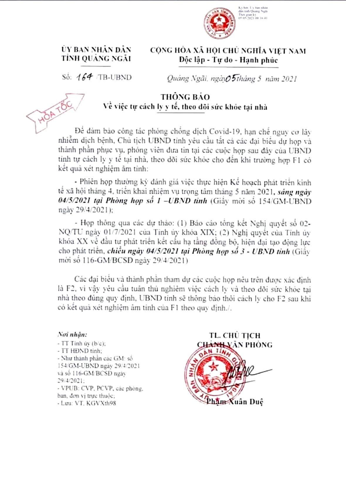 Sáng 5-5, UBND tỉnh Quảng Ngãi phát đi công văn hỏa tốc thông báo về việc tự cách ly y tế, theo dõi sức khỏe đối với đại biểu dự họp và thành phần phục vụ, phóng viên đưa tin tham dự hai cuộc họp ngày hôm qua (4-5) của UBND tỉnh này.
