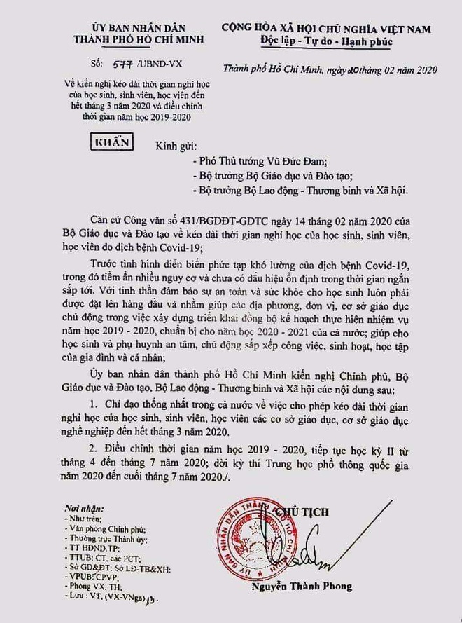 Ngày 20/2, Chủ tịch UBND TP.HCM Nguyễn Thành Phong ký văn bản kiến nghị kéo dài thời gian nghỉ của học sinh, sinh viên đến hết tháng 3 và điều chỉnh thời gian năm học 2019-2020.