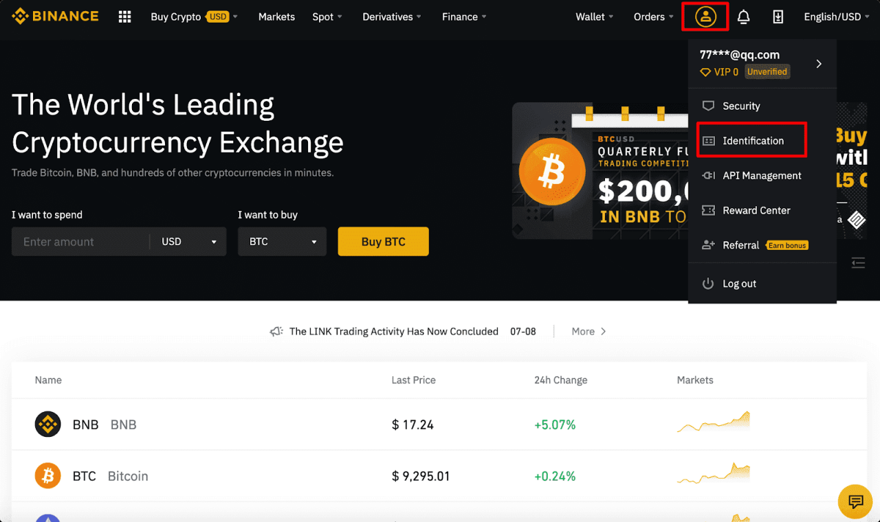 Truy cập website Binance và Đăng nhập vào tài khoản của bạn, sau đó bạn nhấn [Trung tâm Người dùng] – [Nhận dạng].