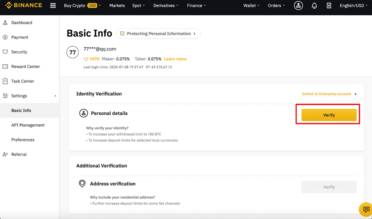 Sau khi đăng ký với Binance, tài khoản của bạn đang ở dạng sơ cấp, ở sơ cấp này bạn chỉ rút được tối đa 2 BTC/ngày. Để có thể rút nhiều hơn 2 BTC ra khỏi sàn mỗi ngày thì bạn cần tiến hành xác minh tài khoản cá nhân lên trung cấp (được gọi là KYC). Sau khi xác minh danh tính cá nhân tài khoản của bạn sẽ được bảo vệ mỗi khi giao dịch trên sàn Binance và hạn mức rút tiền ra khỏi sàn mỗi ngày lên đến 100 BTC.