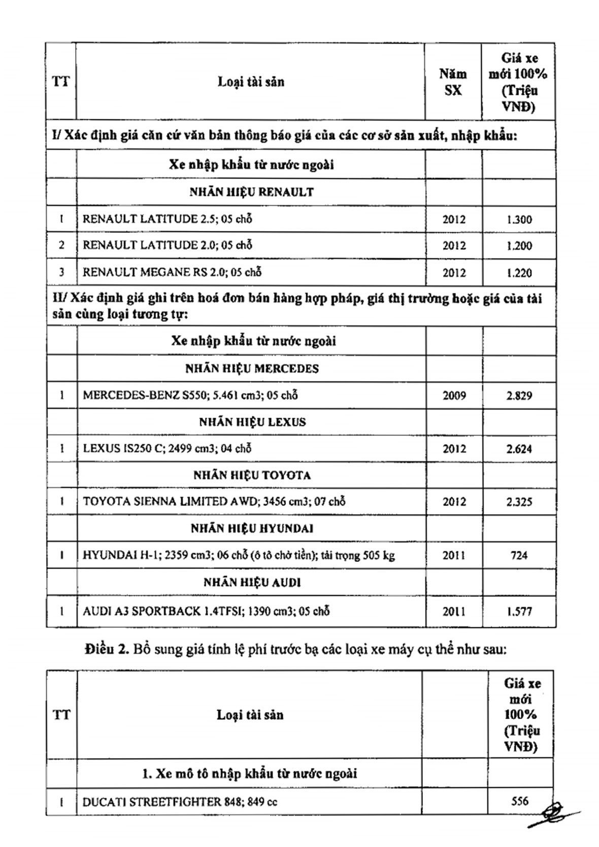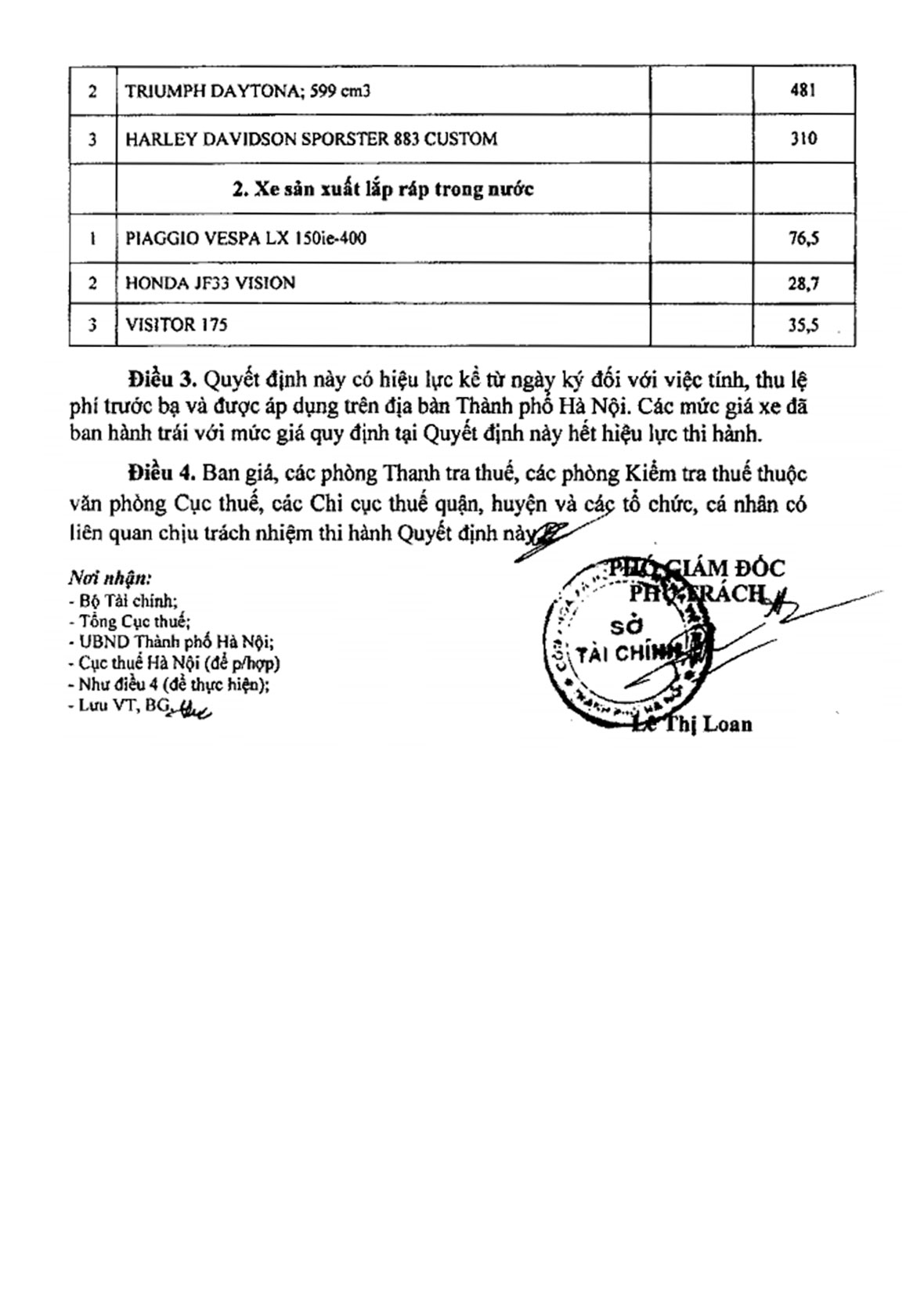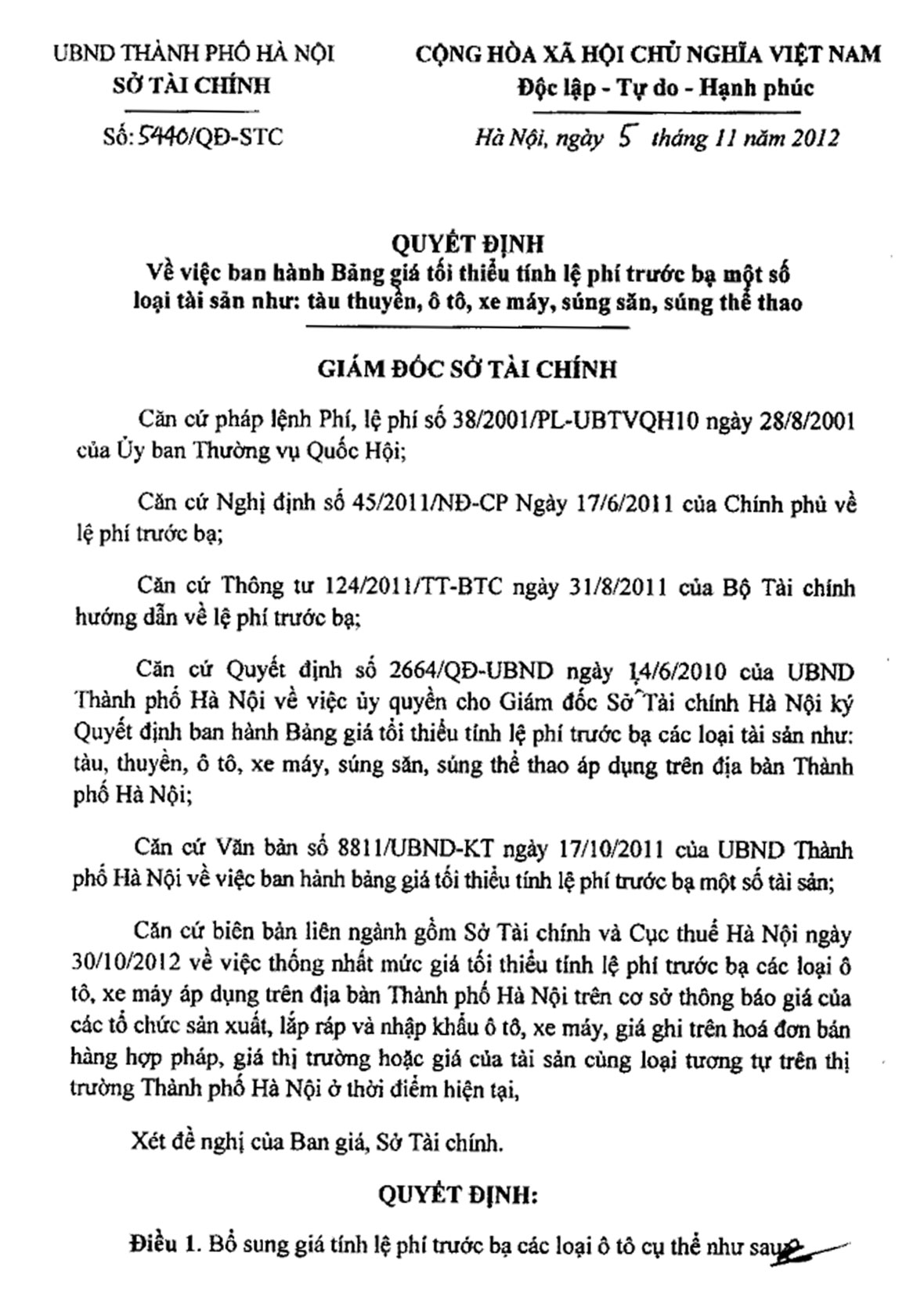 Quyết định 5440/2012 Sở tài chính Hà Nội về bảng giá tối thiểu tính lệ phí trước bạ các loại xe