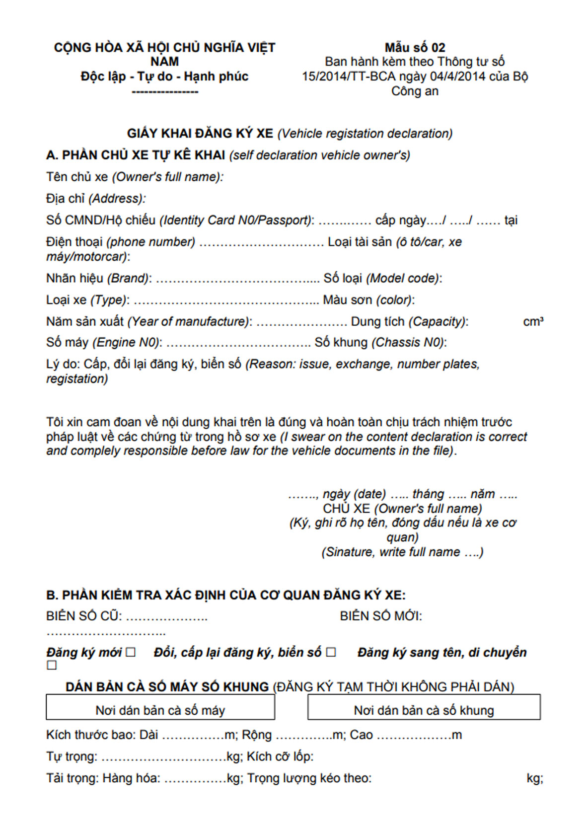 a) Xe nhập khẩu theo hợp đồng thương mại, xe miễn thuế, xe chuyên dùng có thuế suất 0%, xe viện trợ dự án: Tờ khai nguồn gốc xe ô tô; xe gắn máy nhập khẩu (theo mẫu của Bộ Tài chính).