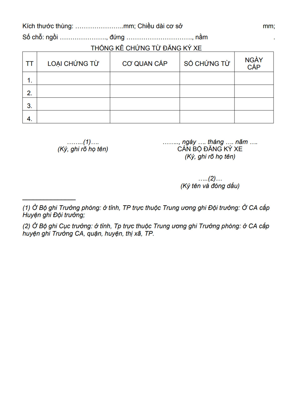 Trường hợp sử dụng tổng thành máy hoặc tổng thành khung của xe đã đăng ký, phải có thêm giấy chứng nhận thu hồi đăng ký, biển số xe (ghi rõ cấp cho tổng thành máy hoặc tổng thành khung).