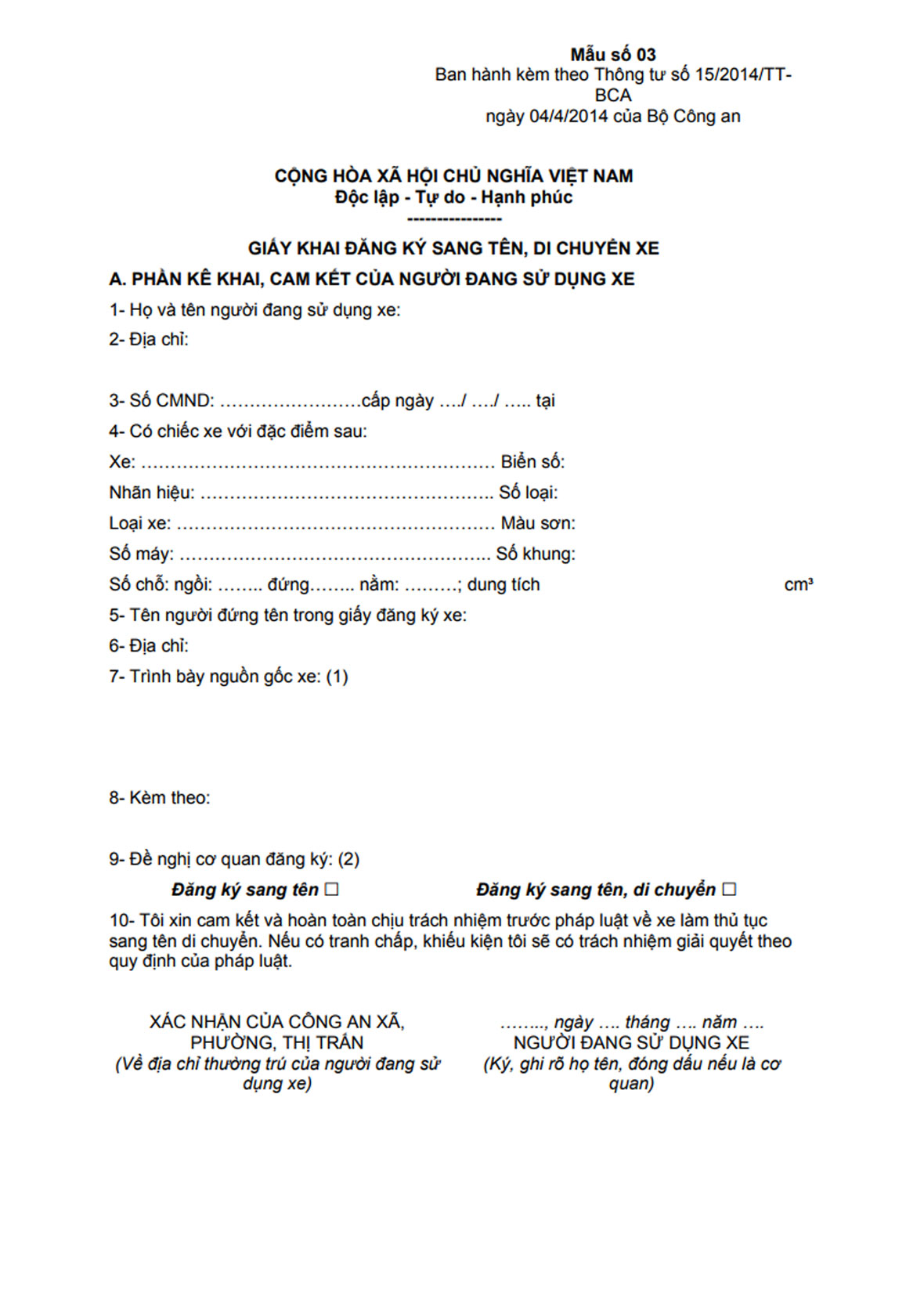 - 02 giấy khai đăng ký sang tên, di chuyển xe (mẫu số 03 ban hành kèm theo Thông tư này) có cam kết của người đang sử dụng xe chịu trách nhiệm trước pháp luật về xe làm thủ tục đăng ký, có xác nhận về địa chỉ thường trú của người đang sử dụng xe của Công an cấp xã nơi người đang sử dụng xe thường trú.